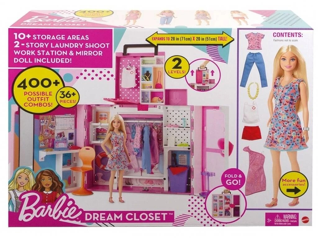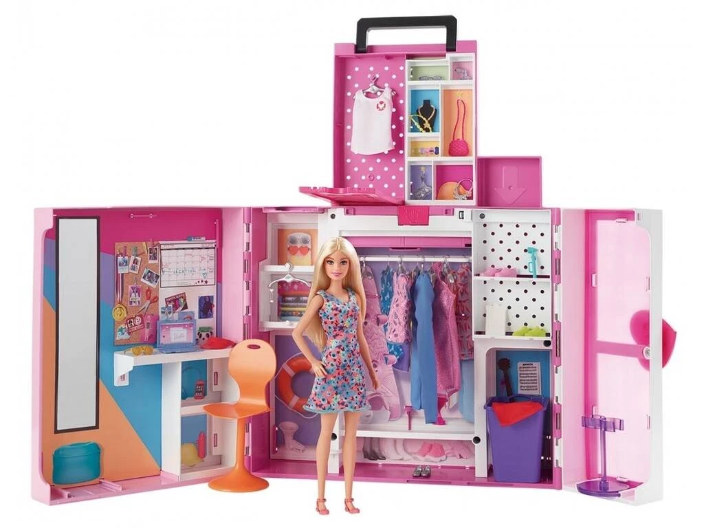 Incluye: 1 muñeca Barbie con larga melena rubia, vestido de flores y un par de zapatos naranjas, 1 armario plegable con dos alturas y diferentes zonas de juego, 1 look de enfermera, 1 look de socorrista, 1 vestido de noche, 1 silla, 1 papelera, 1 ordenador portátil, 10 perchas, 3 pares de calzado para los looks, 3 collares y más accesorios de juego.