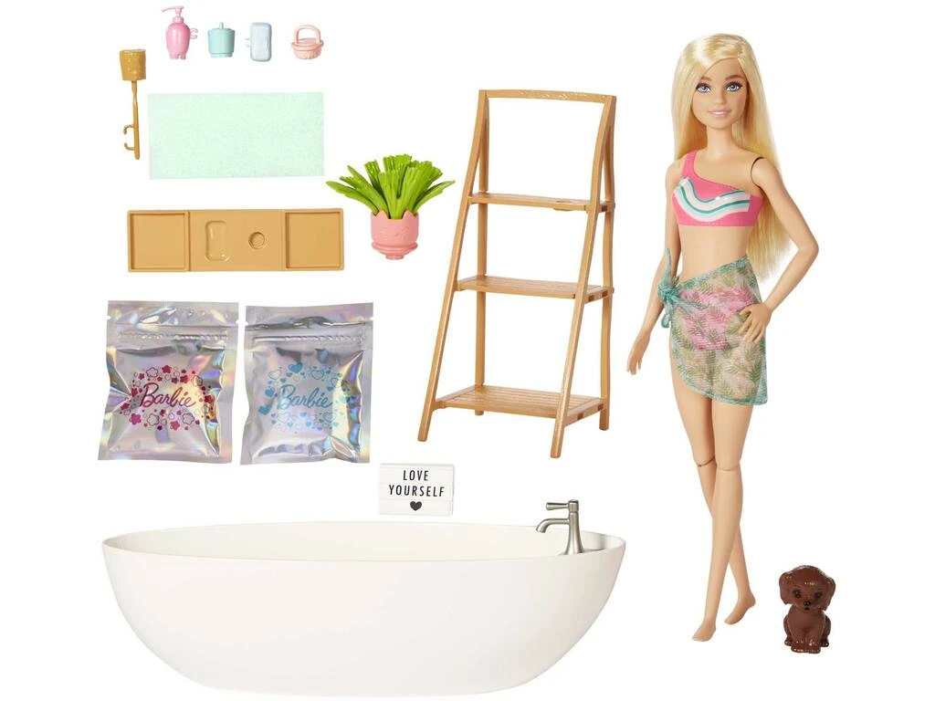 Incluye: 1 muñeca articulada Barbie con larga melena rubia, bañador rosa (en el diseño de la muñeca) y pareo verde transparente, 1 bañera de color blanca, 1 figura perrito de color marrón, 2 sobres con sales de baño de juguete, 1 estantería con tres alturas, 1 toalla azul, 1 estantería para pequeños accesorios, 1 maceta, 1 cartel decorativo, 1 esponja y muchos más accesorios de juego.