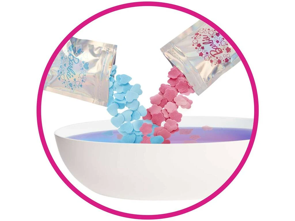 Consigue este divertido set y disfruta de un relajante baño de sales de color junto a Barbie y su inseparable mascota. Crea un espacio de lo más inspirador, para disfrutar así de un momento sin igual junto a tu muñeca preferida. ¡Llena la bañera de agua y suelta los corazones par dar color al baño!
