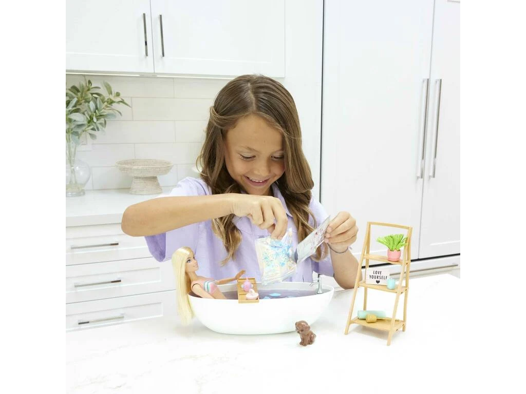 ¡Date un baño de lo más relajante junto a tu muñeca favorita! ¡Al hacerte con este fascinante pack Barbie Bienestar Muñeca Rubia con Bañera de Mattel!