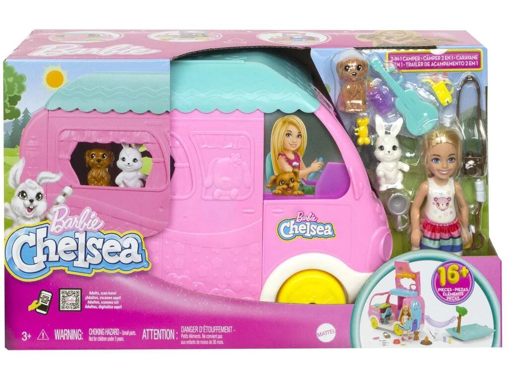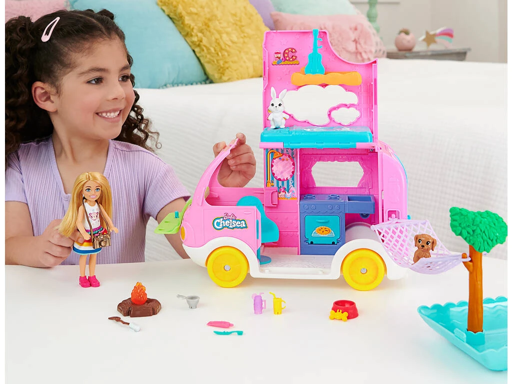 Incluye: una muñeca articulada Chelsea de pelo rubio, ojos azules, una furgoneta camper 2 en 1, un perrito, un conejo, una cámara de fotos, una hamaca, un árbol y mucho más.