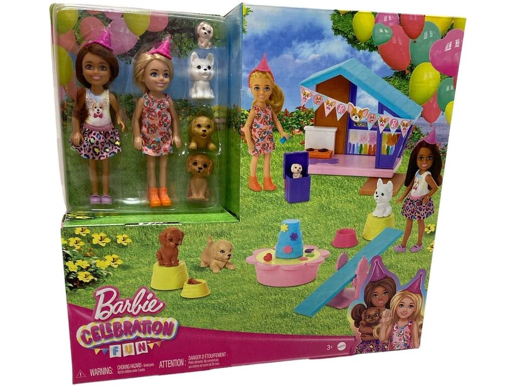 Incluye: una muñeca articulada Chelsea con gorito de fiesta, vestido, zapatos naranjas, una muñeca articulada de pelo castallo, sandalias moradas, falda, camiseta de tirantes, cuatro perritos, una caseta y mucho más.