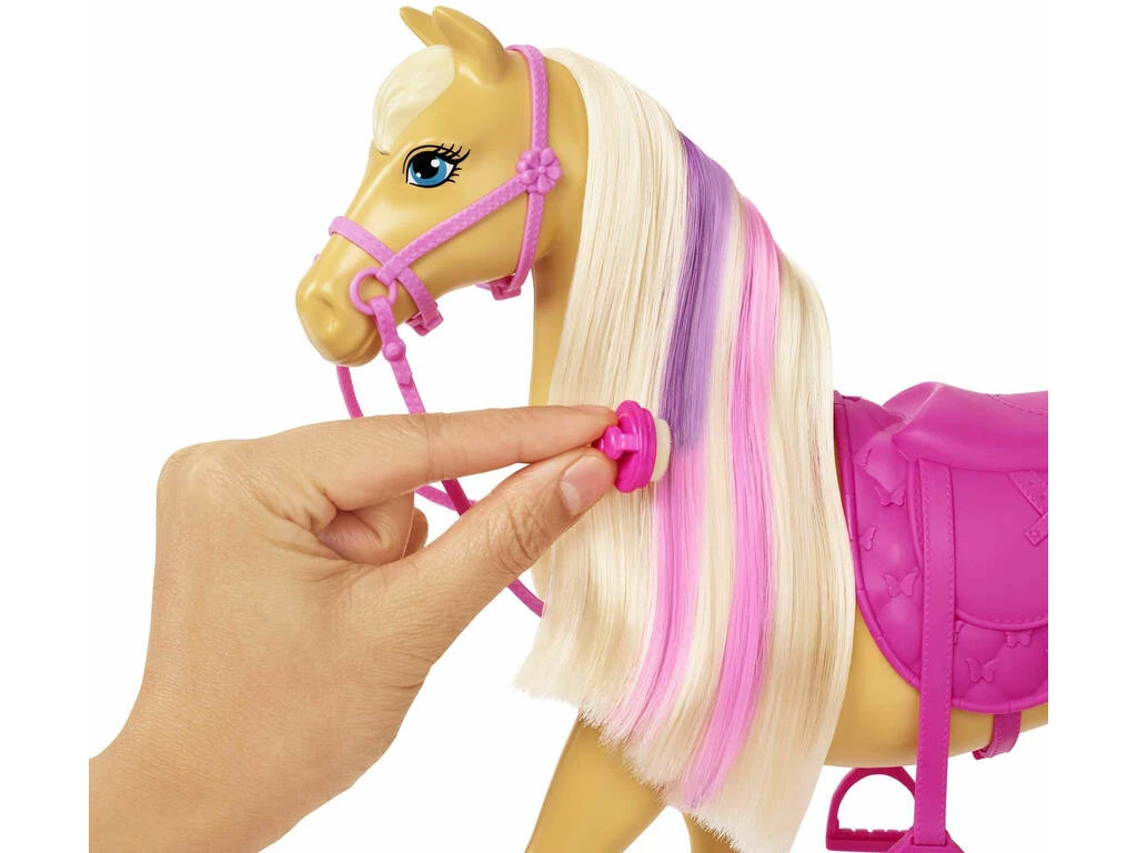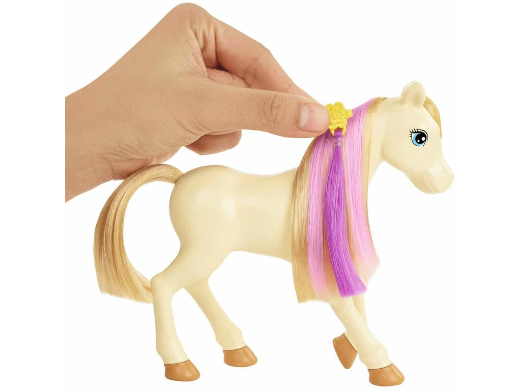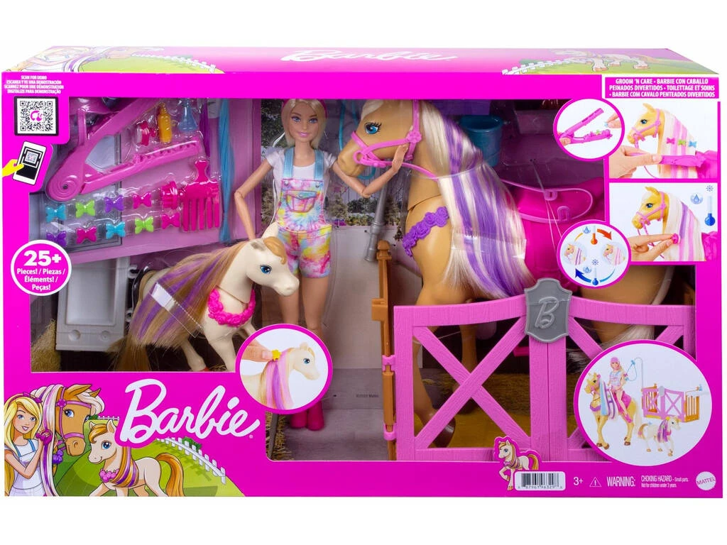 Incluye: 1 muñeca Barbie con larga melena rubia, camiseta blanca de manga corta, mono vaquero multicolor, un par de botas rosas y 1 diadema rosa, 1 caballo con larga melena rubia con mechas y montura rosa, 1 poni con larga melena rubia y collar de flores, 1 aplicador de adornos para el pelo, 1 cepillo para el pelo, 2 mechas de colores, 1 casco para la muñeca y muchos más accesorios de juego.
