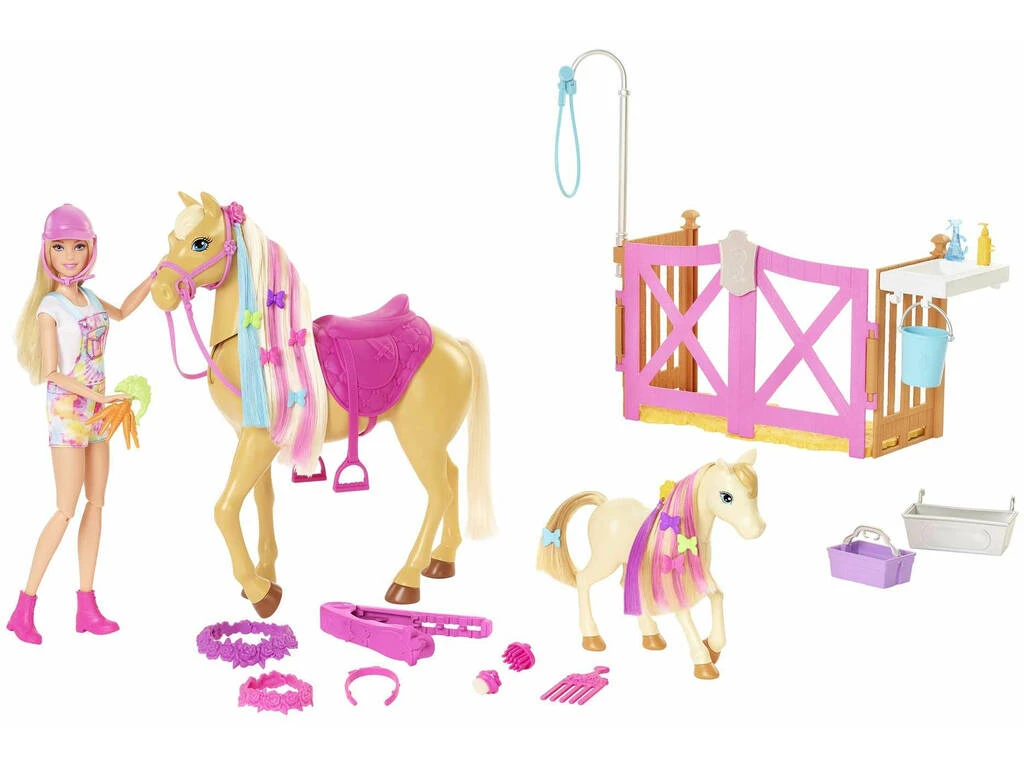 Consigue este completo set y crea momentos inolvidables en el establo y junto a Barbie. Ayúdale a limpiar el establo y mimar a sus nuevos amiguitos, decora sus largas melenas rubias con todos los accesorios incluidos, añade mechas de colores y mucho más.