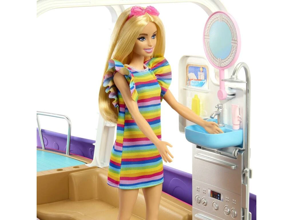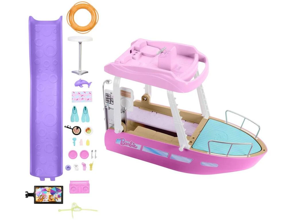Incluye: 1 barco Dream Boat de Barbie de color rosa con 6 áreas de juego, 1 tobogán morado, 1 mini piscinita, 1 salvavidas, 1 mesa, 1 par de aletas, 1 radiocasete, 1 gafas de buceo, 1 delfín de juguete, 1 sartén, 2 platos, 1 perrito y muchos más accesorios de juego.