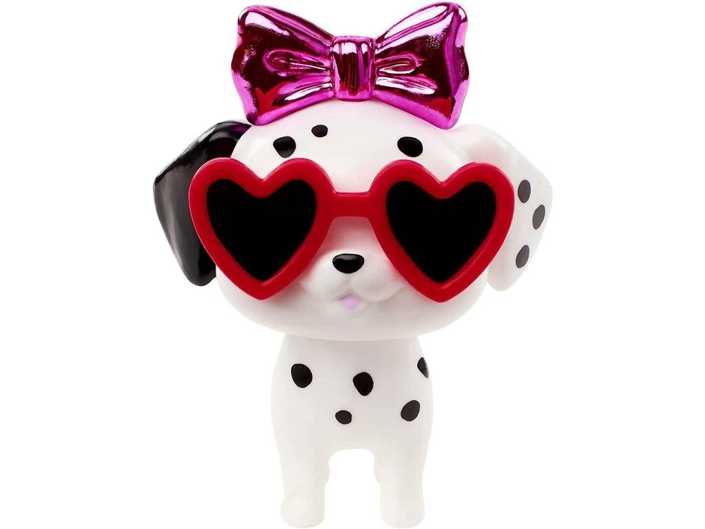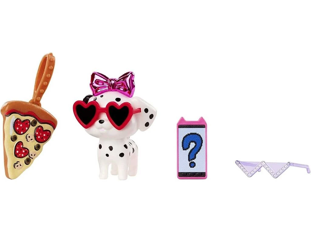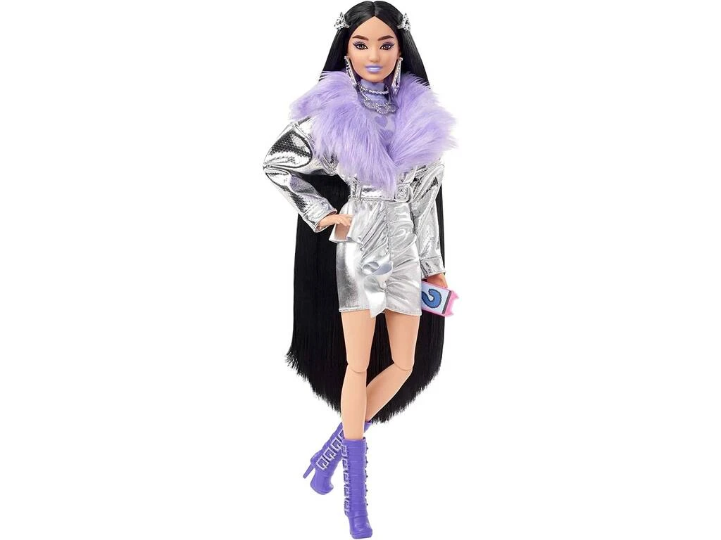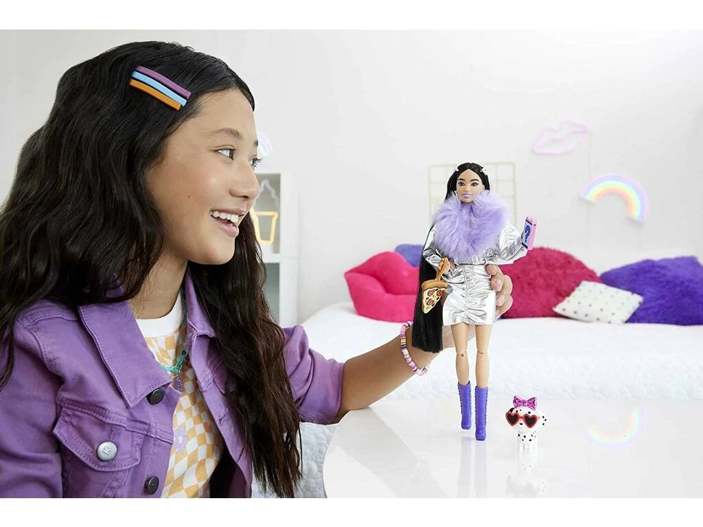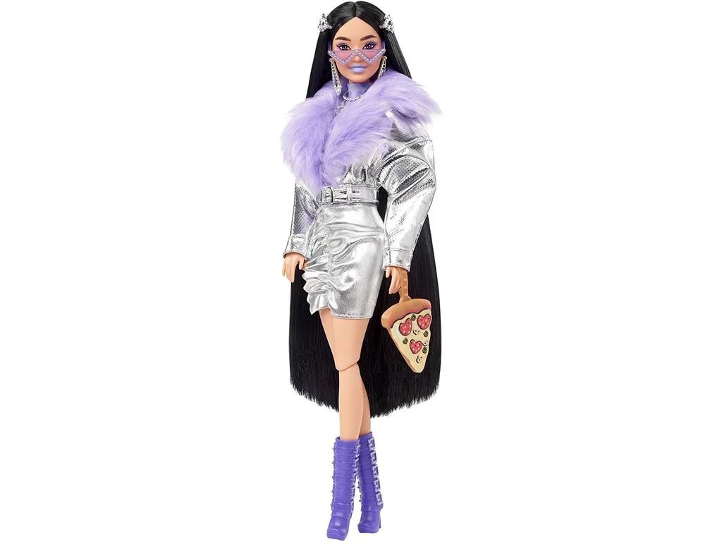 Incluye: 1 muñeca Barbie con larga melena morena, vestido plateado con cuello de pelo morado, cinturón y manga larga, un par de botas altas moradas, un par de pendientes plateados y un par de ganchos plateados para el pelo, 1 figura perrito con gafas de sol y lazo rosa, 1 gafas de sol para la muñeca, 1 bolso con forma de pizza y 1 móvil rosa.