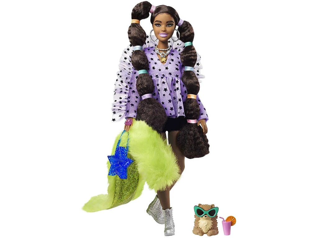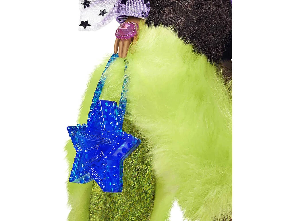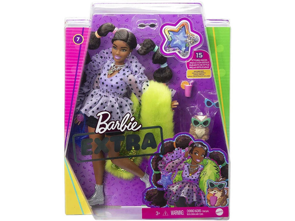 Incluye: 1 muñeca Barbie Extra con camiseta violeta con estrellas, pantalón negro corto, botas plateadas brillantes, gomas de colores para el pelo, collares plateados y dorados, pulseras y bufanda de color verde, 1 mascota, 2 gafas de sol para la mascota, 1 gafas de sol para la muñeca y 1 refresco.