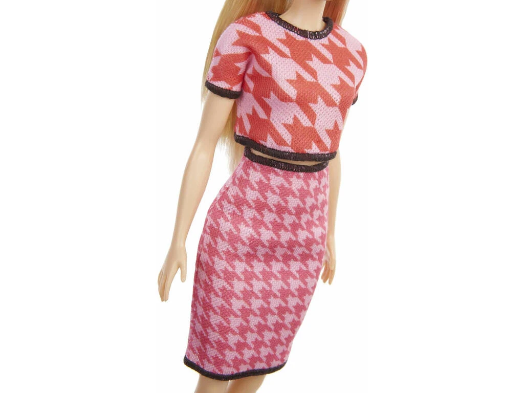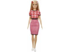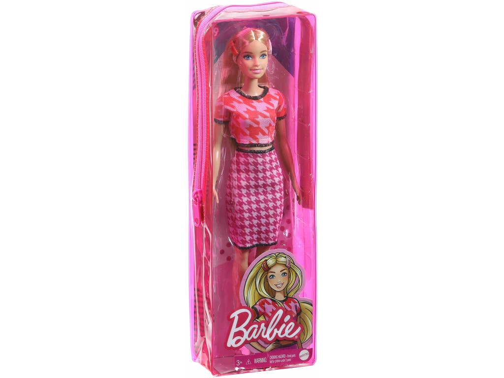 Incluye: 1 muñeca Barbie Fasionista con pelo rubio, camiseta roja estilo pata de gallo, falda rosa estilo pata de gallo, deportivas de color blanco y dos broches para el pelo y 1 estuche de plástico con cremallera para la muñeca.