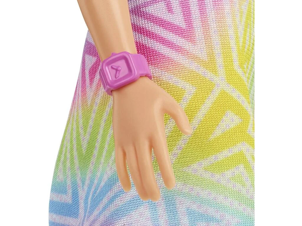 Incluye: 1 estuche de color rosa con cierre de cremallera para la muñeca y 1 muñeca Barbie con larga melena rubia y morada, mono con prismas de color arcoíris y tirantes negros, un par de deportivas verdes y 1 reloj de color rosa.