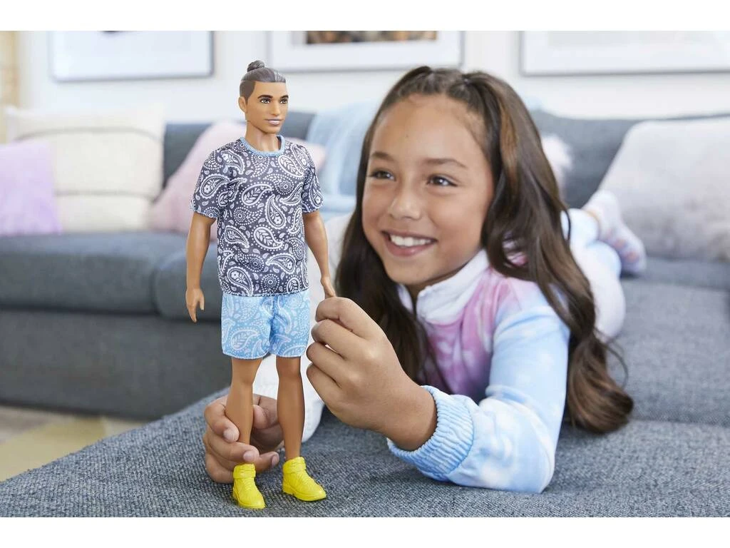 El look más veraniego de Ken ya está aquí, disfruta junto a él de incontables planes por Malibu. Visita la piscina de Barbie y pásalo en grande junto a todos sus amigos y amigas. Esta nueva versión de Ken muestra a un chico alto, con pelo castaño y moño, y un destacable look con estampado estilo bandana.