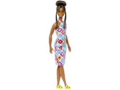 Incluye: una muñeca articulada barbie fashionista con pelo castaño, ojos marrones, vestido crochet estampado de rombos azules, amarillos, rojos, sandalias amarillas y gafas amarillas.