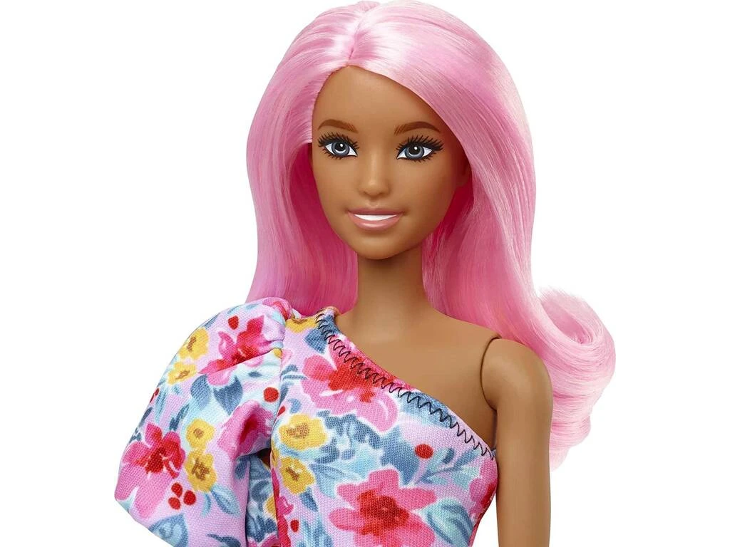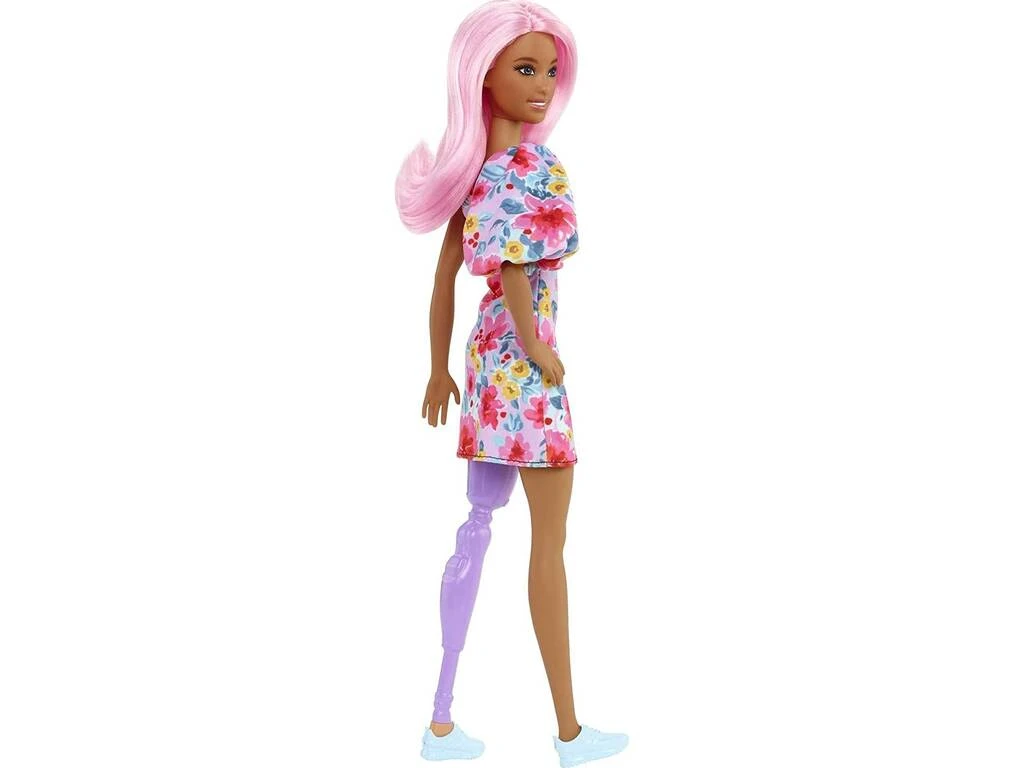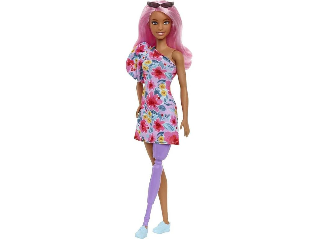 Incluye: 1 muñeca Barbie con con gran melena de color rosa, vestido morado con flores, 1 par de deportivas moradas, 1 pierna protésica morada y 1 gafas de sol negras.