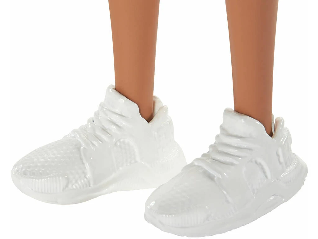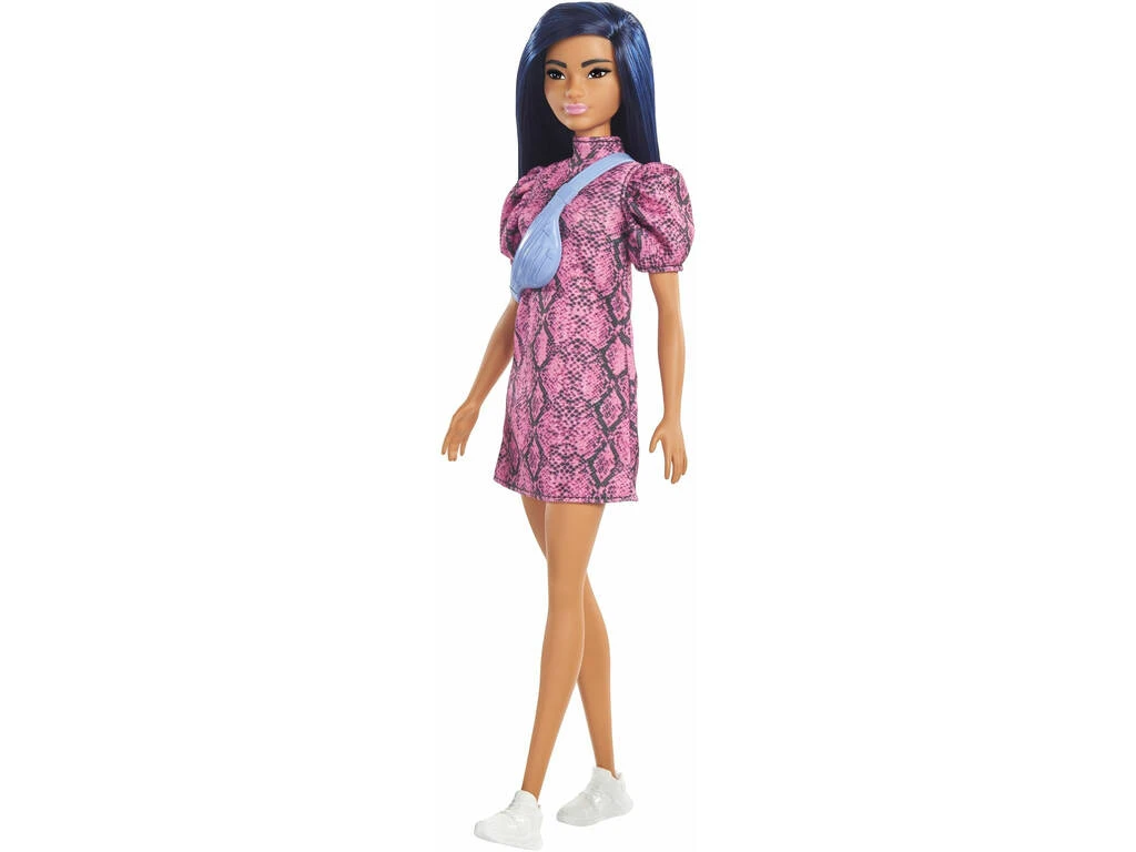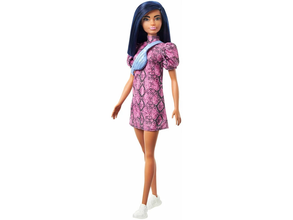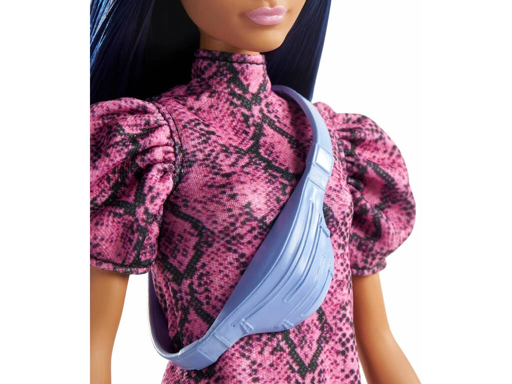 Incluye: 1 estuche de plástico con cierre de cremallera y 1 muñeca Barbie con pelo negro liso, vestido rosa con detalles negros de serpiente, riñonera azul y un par de zapatillas blancas.