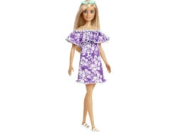 Incluye: 1 muñeca Barbie con larga melena rubia, vestido violeta con flores blancas y un par de chanclas blancas.