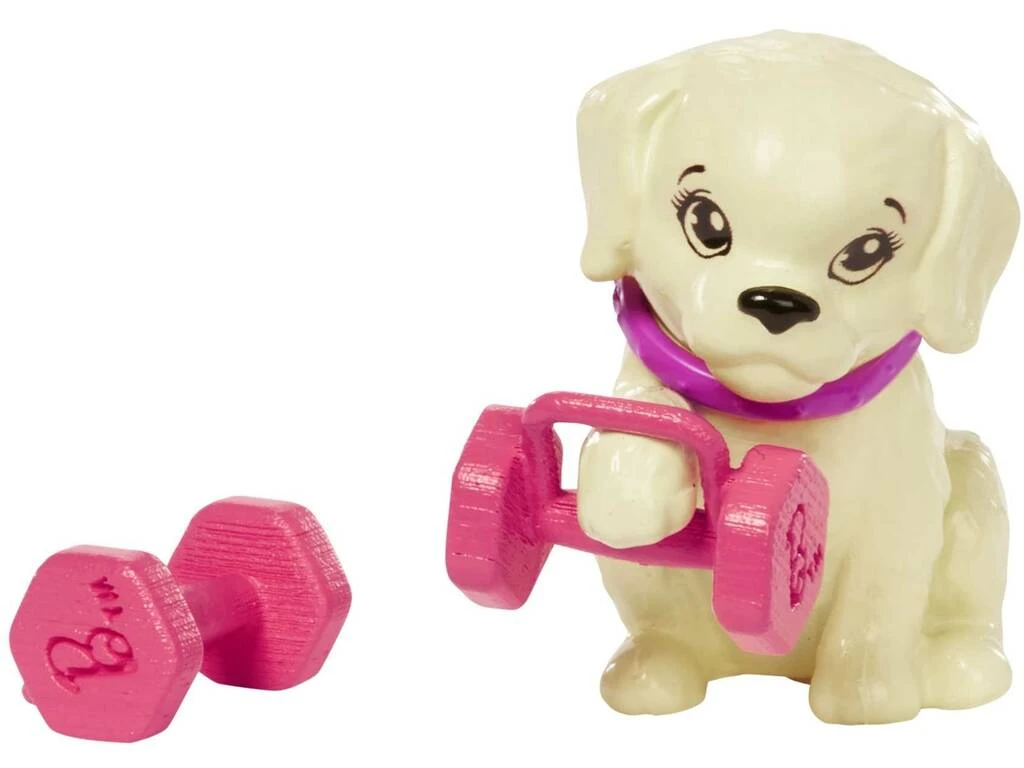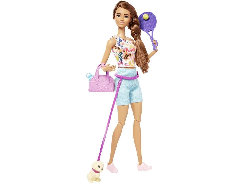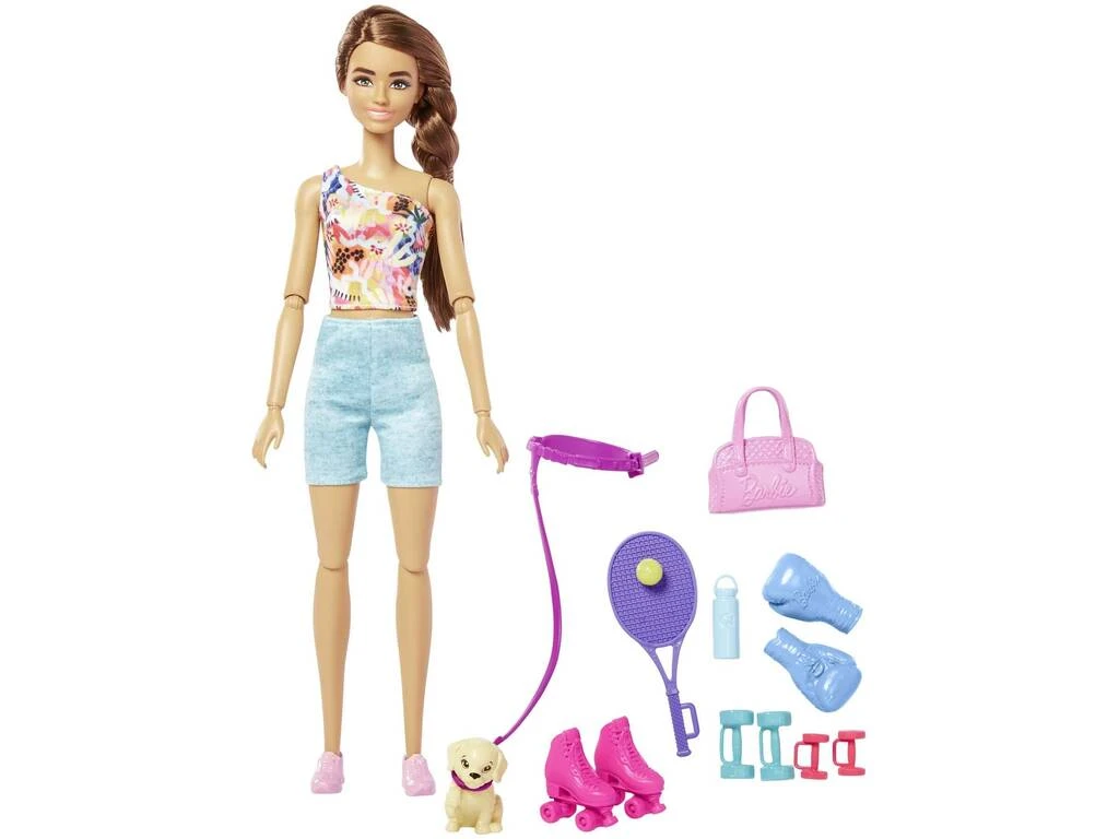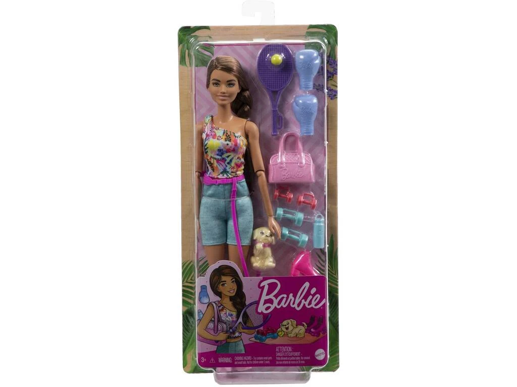Incluye: 1 muñeca articulada Barbie con larga melena morena, top multicolor con tirante, pantalón deportivo de color azul y un par de deportivas de color rosa, 1 figura perrito, 1 correo especial para practicar deporte con el perrito, 1 raqueta de tenis color morada, 1 pelota de tenis, 1 par de guantes de boxeo azules, 4 pesas, 1 par de patines fucsia, 1 botella de agua y 1 bolsa deportiva de color rosa con el logo de Barbie.