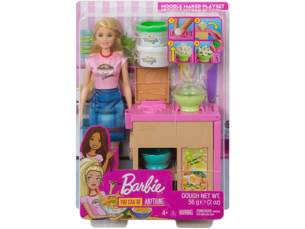 Consigue este genial pack que incluye una divertida muñeca Barbie con falda vaquera, zapatillas blancas y una camiseta rosa con un plato de noodles sonriente. Además, se incluye un práctico mueble de cocina donde podrás preparar los ricos noodles, utilizando la plastilina incluida y los moldes que hay en el propio mueble.