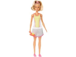 Diviertete explorando un mundo donde la diversión competitiva jugando a ser que es lo que quieres ser mientras te diviertes, si te encanta el deporte puedes elegir esta Barbie Quiero ser Tenista, vestida con mucho glamour tenista luce un vestido con ribetes rosas, falda estampada y una raya amarilla. Está equipada con una raqueta con pelota para practicar su swing y demostrar sus habilidades sobre la pista. Disfruta de las posibilidades de expresión creativa y diversión que te puede proporcionar el jugar con esta muñeca temática.