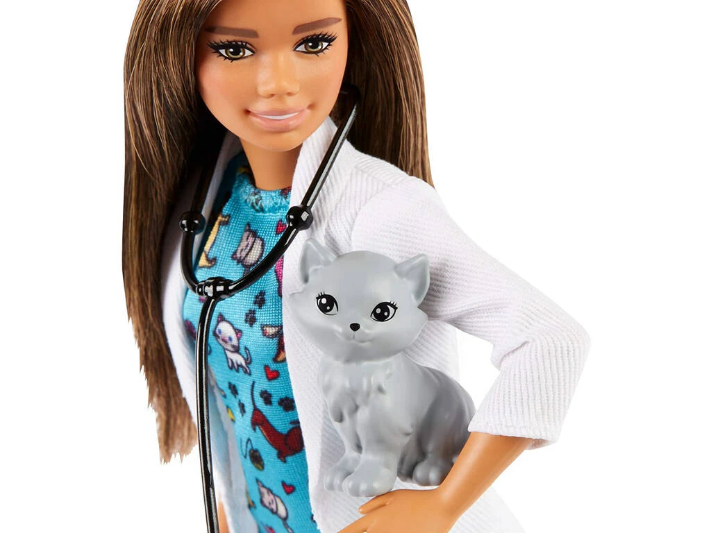 Podrás ser lo que quieras, lo que imagines y en lo que creas siempre que lo persigas con todas tus ganas, con la Barbie Quiero Ser Veterinaria podrás curar a las mascotas más queridas por todos. La muñeca morena con pelo largo lleva un vestido con animales, objetos y juguetes que pertenecen a la vida cotidiana de los mismos, luce una bata blanca, unos zapatos y un estetoscopio para comprobar las constantes del gatito que viene incluido, las posibilidades de recreación del mundo son muchísimas y solo tu imaginación puede poner los limites al juego.