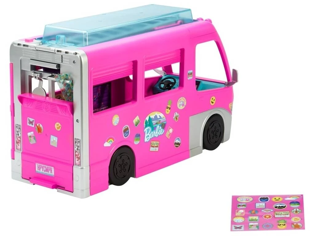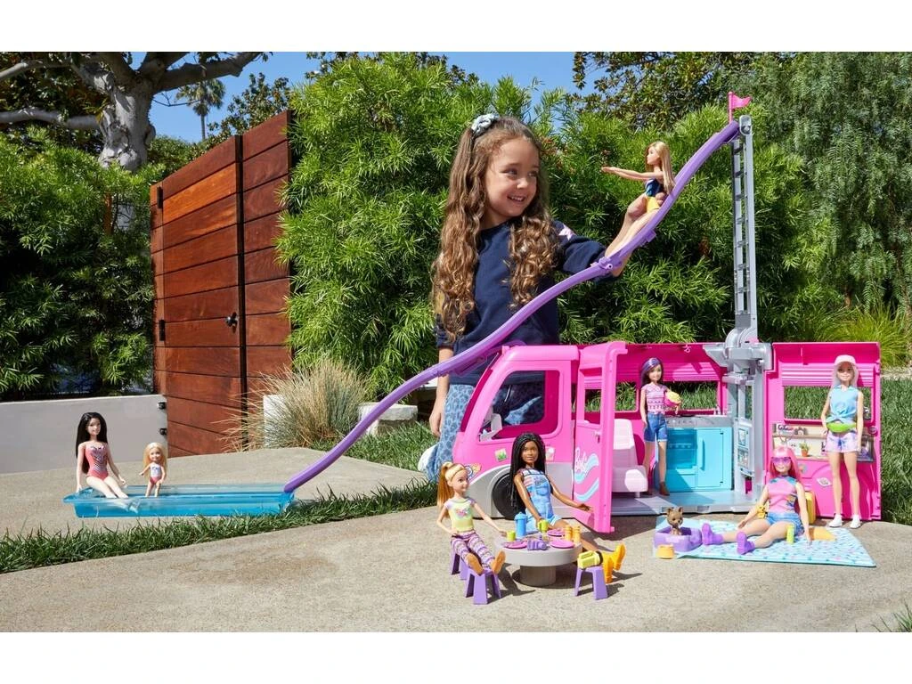 Consigue esta impresionante autocaravana de Barbie llena de rincones donde jugar y desarrollar tus nuevas aventuras. Encuentra un lugar especial, conduce hasta allí y abre este vehículo que en su interior guarda desde una refrescante piscina, ha una cocina donde preparar los platos más deliciosos.
