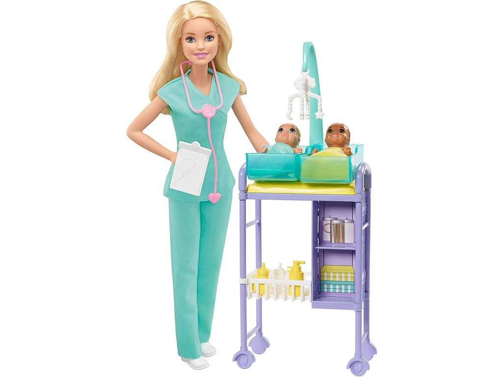 Incluye: 1 muñeca Barbie Yo Quiero Ser Pediatra, 2 muñecos bebés, 1 mueble especial con espacio para los bebés y los accesorios, 2 biberones, 1 estetoscopio y 1 bote.