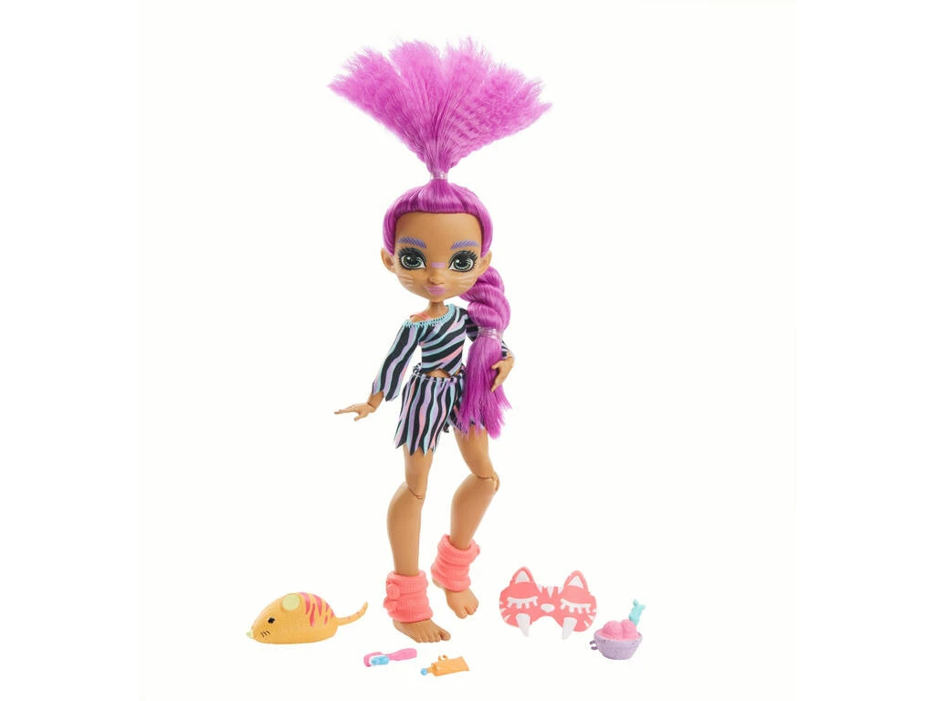 Incluye: 1 muñeca Roaralai de Cave Club con vestido multicolor a rayas, antifaz rosa, goma para el pelo y calentadores rosas, 1 peluche de ratón naranja, 1 bote de pasta de dientes, 1 cepillo de dientes y 1 bol con helado de fresa.