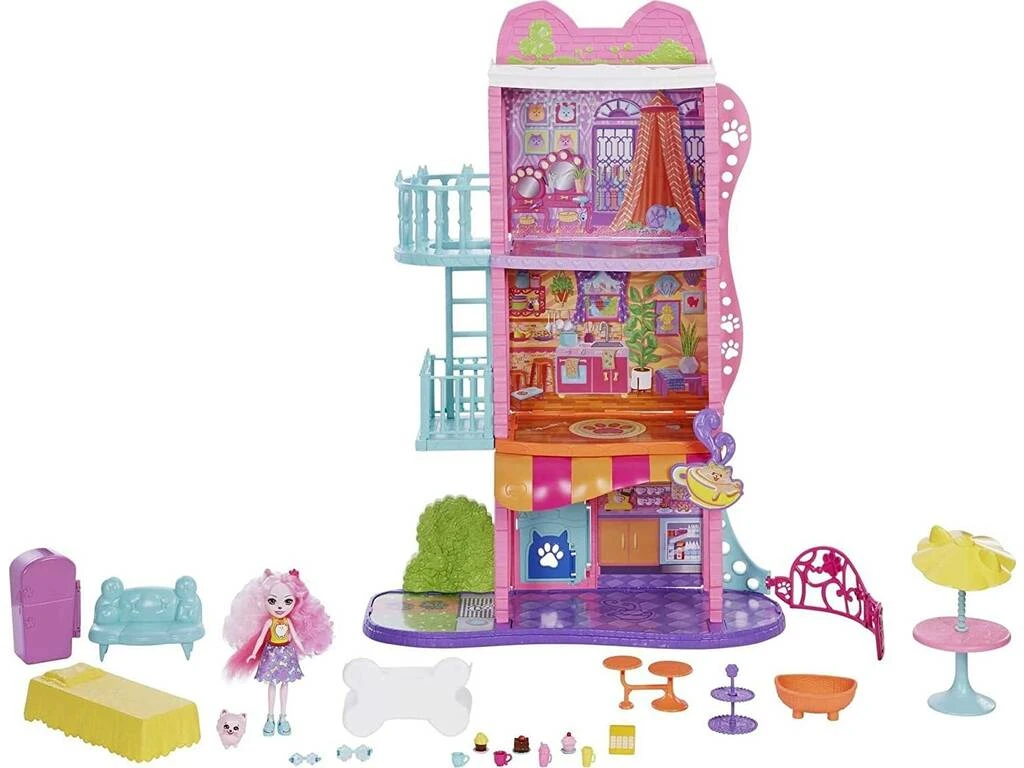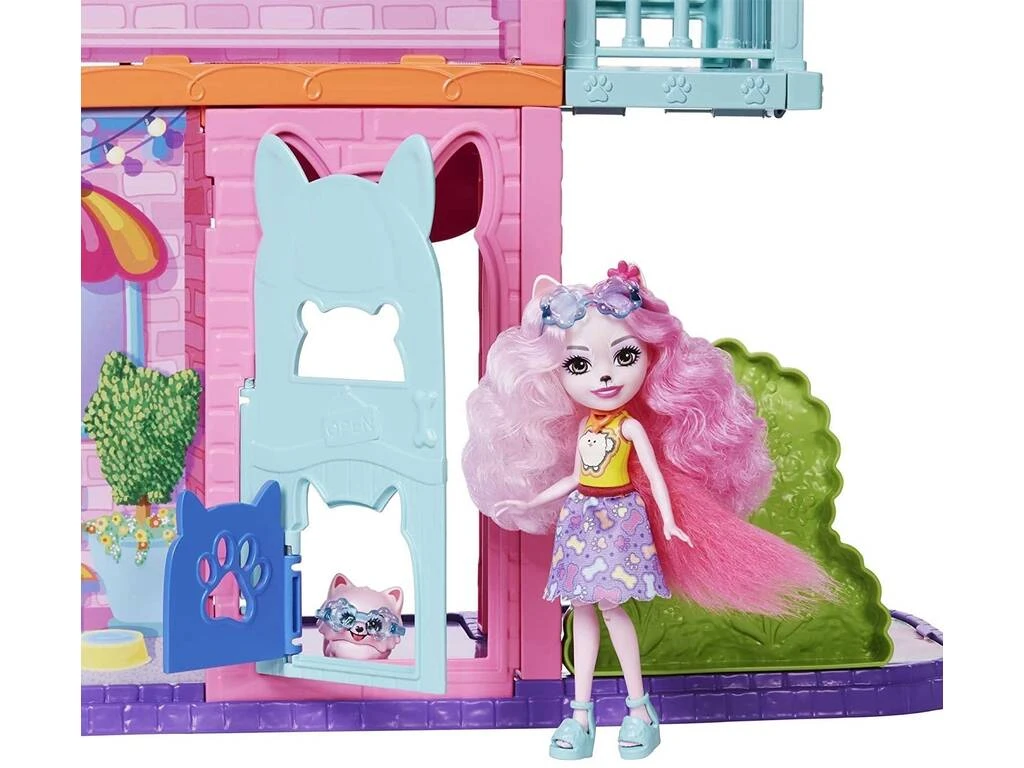 ¡Visita uno d ellos edificios más alucinantes de la ciudad de Enchantimals! ¡Llévate a casa el nuevo Enchantimals City Tails Cafetería y Casa de la Ciudad de Palmer Pomerian de Mattel!