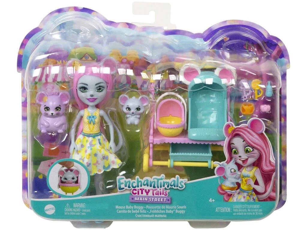Incluye: 1 muñeca articulada Mauria Mouse con larga melena rosa, falda de tela, zapatos azules y adorno en su oreja, 1 mascota ratoncito violeta con pelito, 1 mascota ratoncito gris, 1 carro doble para mascotas con bandeja inferior y más accesorios.