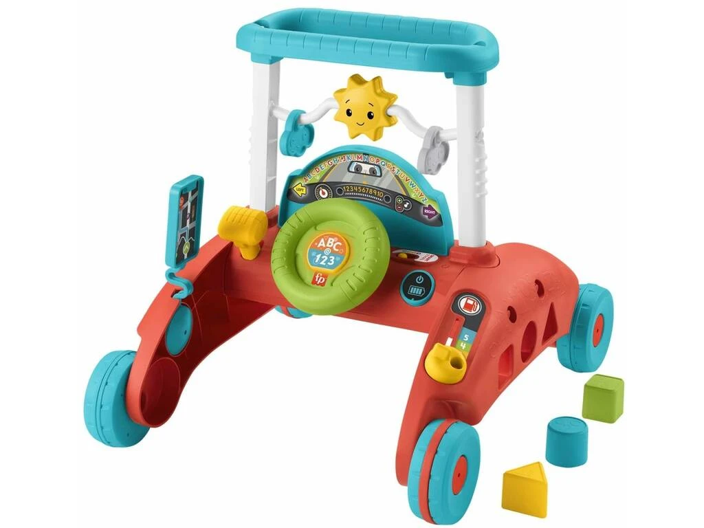 Incluye: 1 andador Steady Speed con dos lados de juego, más de 50 canciones, sonidos, melodías y frases, 3 bloques con formas y colores variados, volante con luz y claxon, ruedas de plástico y asa fácil de garrar desde ambos lados.
