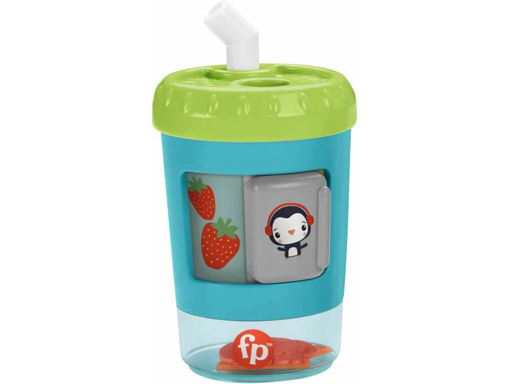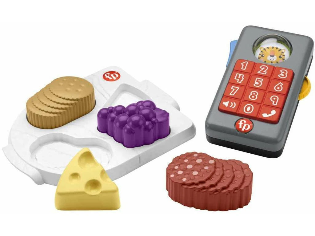 Incluye: Un vaso para batidos de color verde y azul, un teléfono con luces y sonidos y una bandeja para snakcs como queso o galletas de juguete.