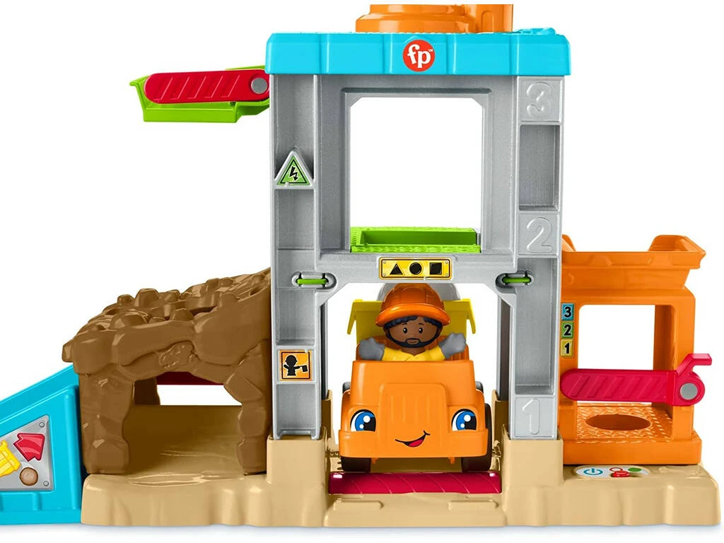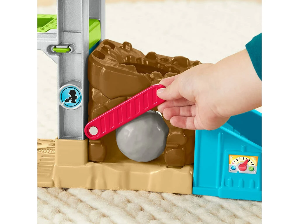 Incluye: 1 playset con botones que activan sonidos de acción, varias alturas de juego, rampa, grúa y más sorpresas, 2 figuras operarios de obra, camión con espacio para una figura, 2 rocas redondas y más accesorios de juego.