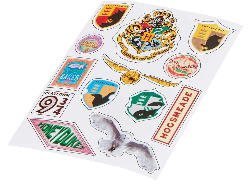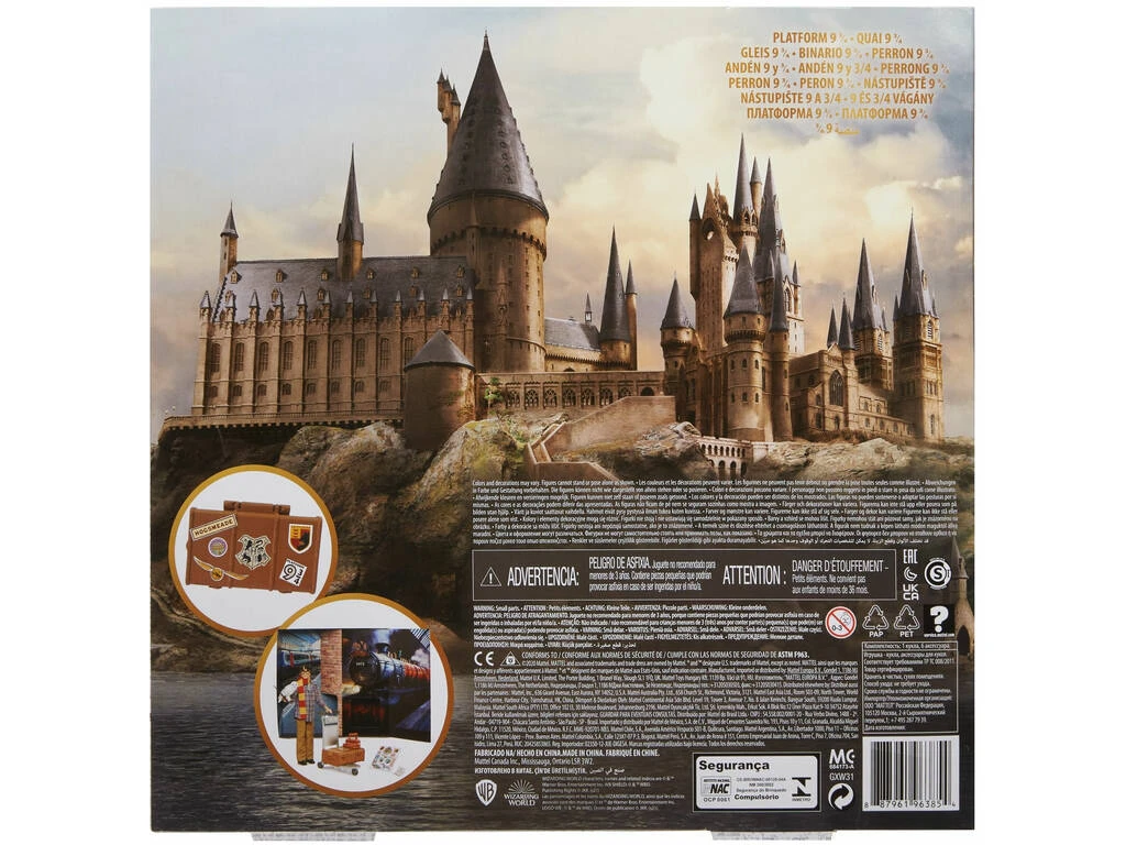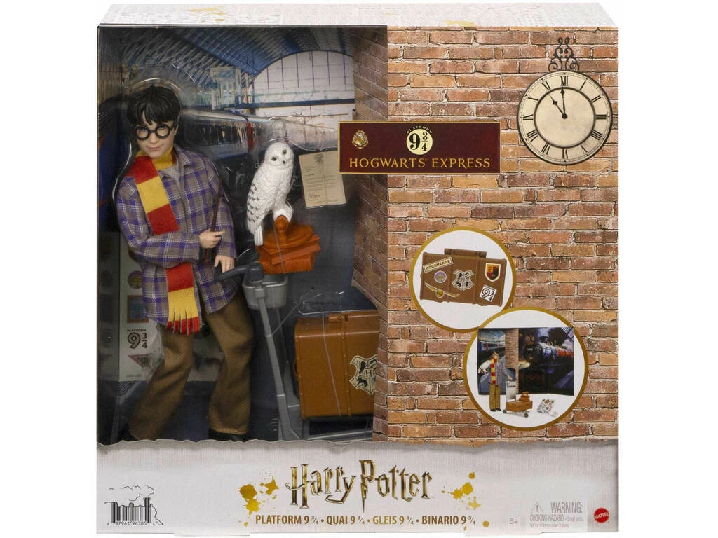 Incluye: 1 muñeco Harry Potter con camiseta gris, camisa de cuadros, pantalón marrón largo, zapatos negros, gafas y bufanda, 1 figura Hedwig, 1 carrito para maletas, 1 maleta, pegatinas para la maleta, libros amontonados y escenario de cartón de La Plataforma 9 ¾.