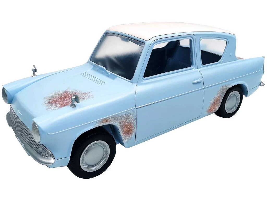 Incluye: 1 vehículo volador de color azul con puertas que se abren, hueco para figuras y muchos más detalles, 1 muñeco Harry Potter con pantalón marrón, camisa a cuadros y zapatos y 1 muñeco Ron Weasley con pantalón marrón, jersey marrón y zapatos.