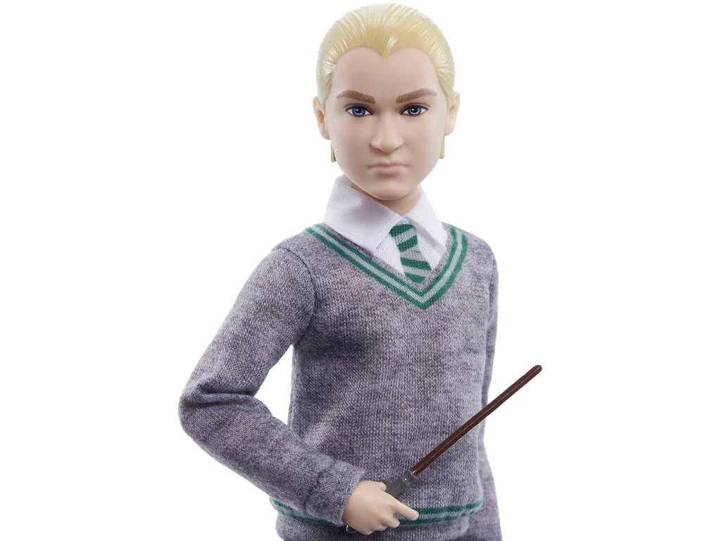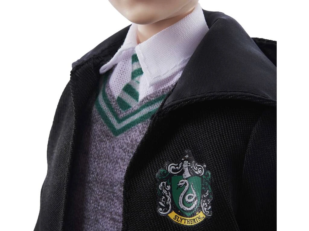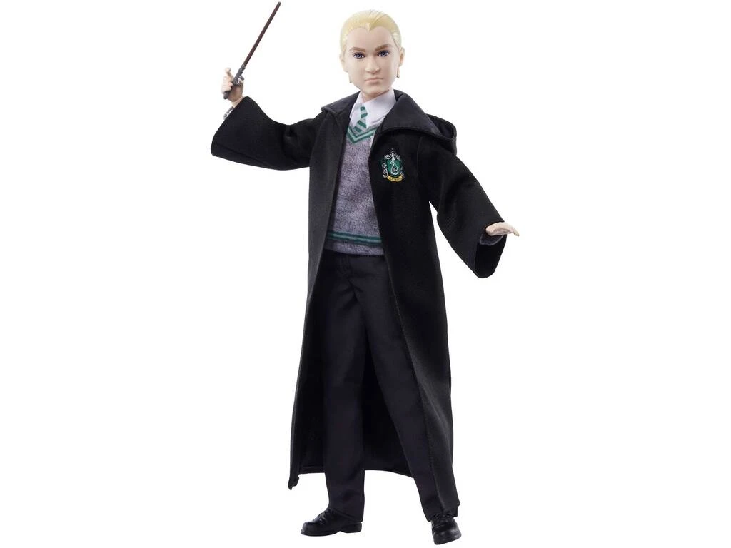 Incluye: 1 muñeco articulado de Draco Malfoy con uniforme de Slytherin, túnica de Slytherin, zapatos de color negro y varita mágica.