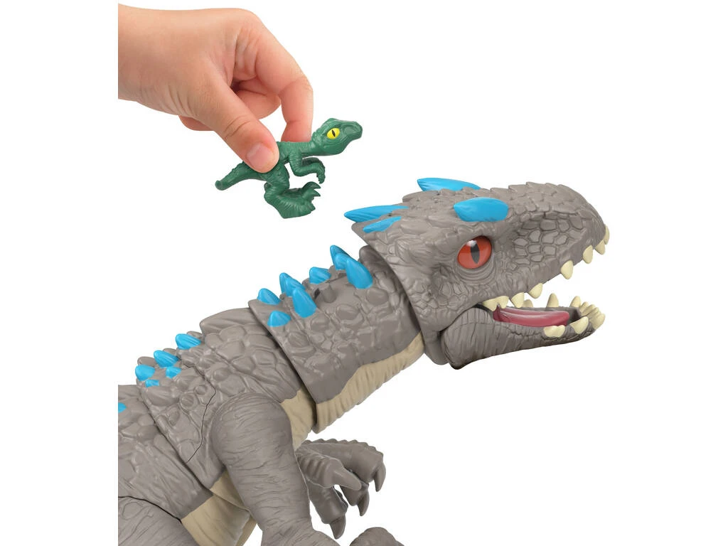 Hazte con este impresionante muñeco articulado del indomable dinosaurio que salió de un laboratorio, y que ahora es una de las mayores amenazas para el parque. Pon a prueba las habilidades del Indominus al colocar el pequeño dinosaurio en su cuello, y comenzar a mover su cola en diferentes direcciones. ¡Su mandíbula se moverá de un lado a otro mostrando su capacidad de amenaza y destrucción! ¡Recrea momentos inolvidables de la nueva saga con este divertido pack!