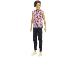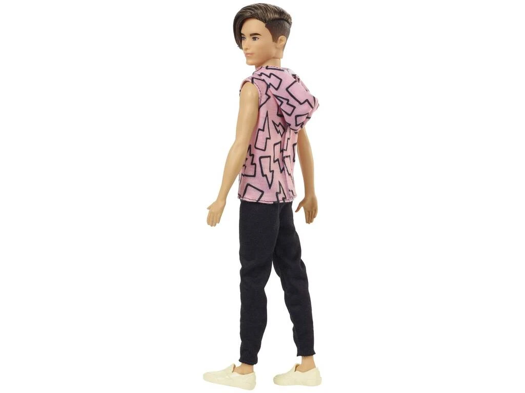 Incluye: 1 estuche de color rosa con cierre de cremallera para el muñeco y 1 muñeco Ken con pelo enraizado de color castaño, camiseta sin manga con capucha de color rosa y diseño de rayos negros, pantalón largo negro y un par de deportivas blancas.