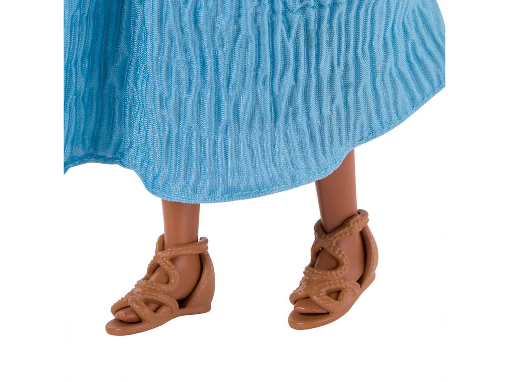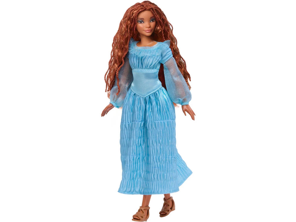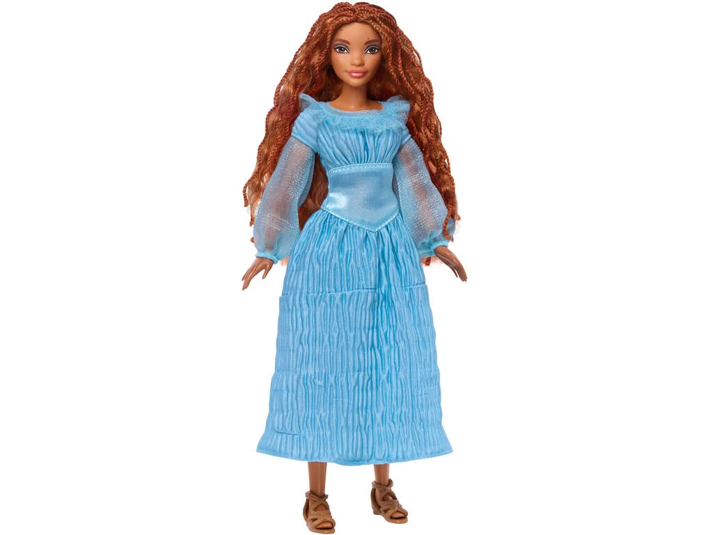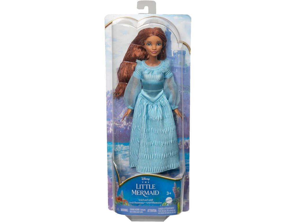 Incluye: 1 muñeca Ariel en la superficie con larga melena castaña, vestido largo de color azul y un par de zapatos marrones.