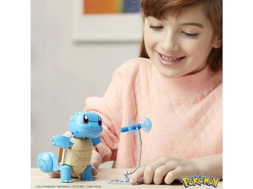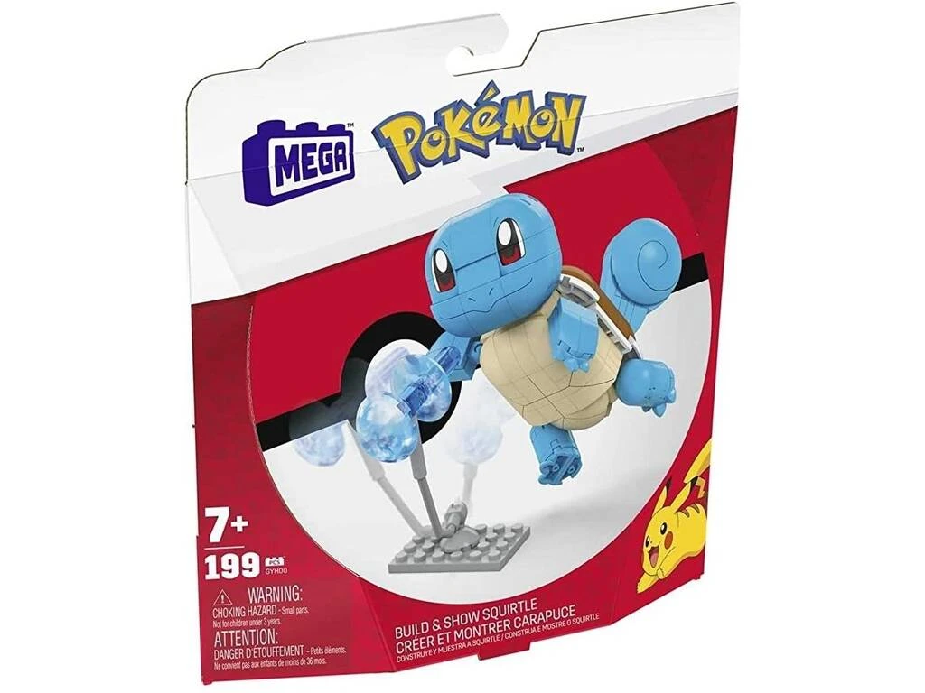 Incluye: 1 figura construible articulada de Squirtle, 1 base para ataque de la figura con energía de agua y 1 imperdible con forma de Poké Bola de color azul.