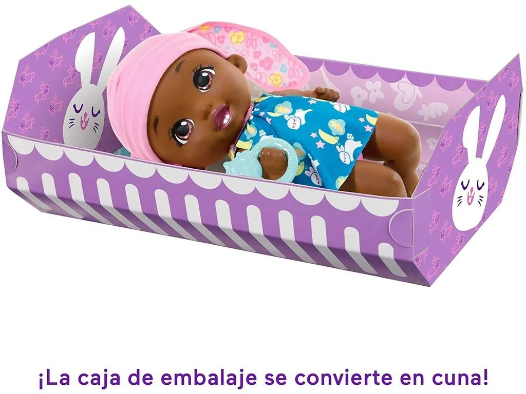 Incluye: 1 muñeca perfumada con vestido 2 en 1 de día y de noche, gorrito rosa con orejitas de conejo, 1 mordedor de color azul, 1 cepillo de dientes de color naranja y 1 bote color rosa de pasta de dientes.