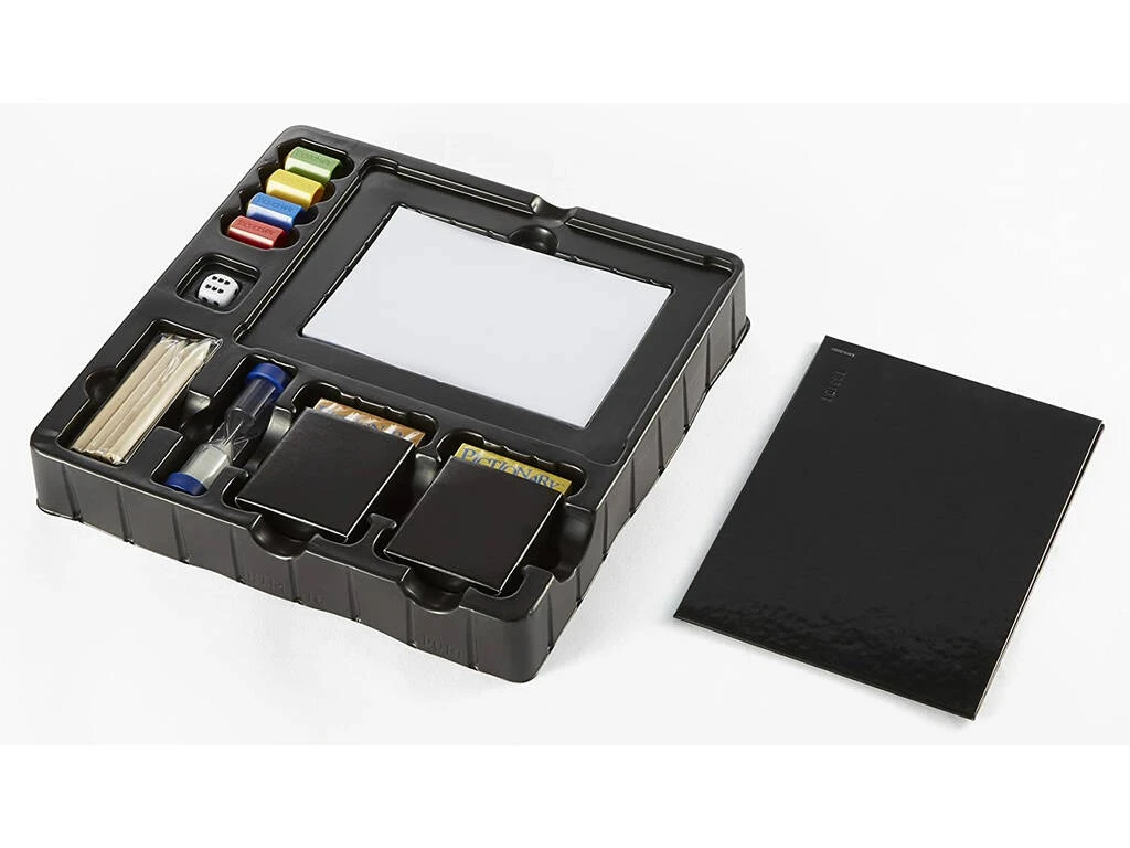 Incluye: 1 caja de almacenaje ilustrada, 120 cartas de juego para adultos, 80 cartas de juego para niños, 2 cajas para las cartas, 4 tarjetas de categoría, 2 lápices, 1 bloc de notas, 1 tablero de juego, 4 peones de juego, 1 dado, 1 reloj de arena e instrucciones de juego.
