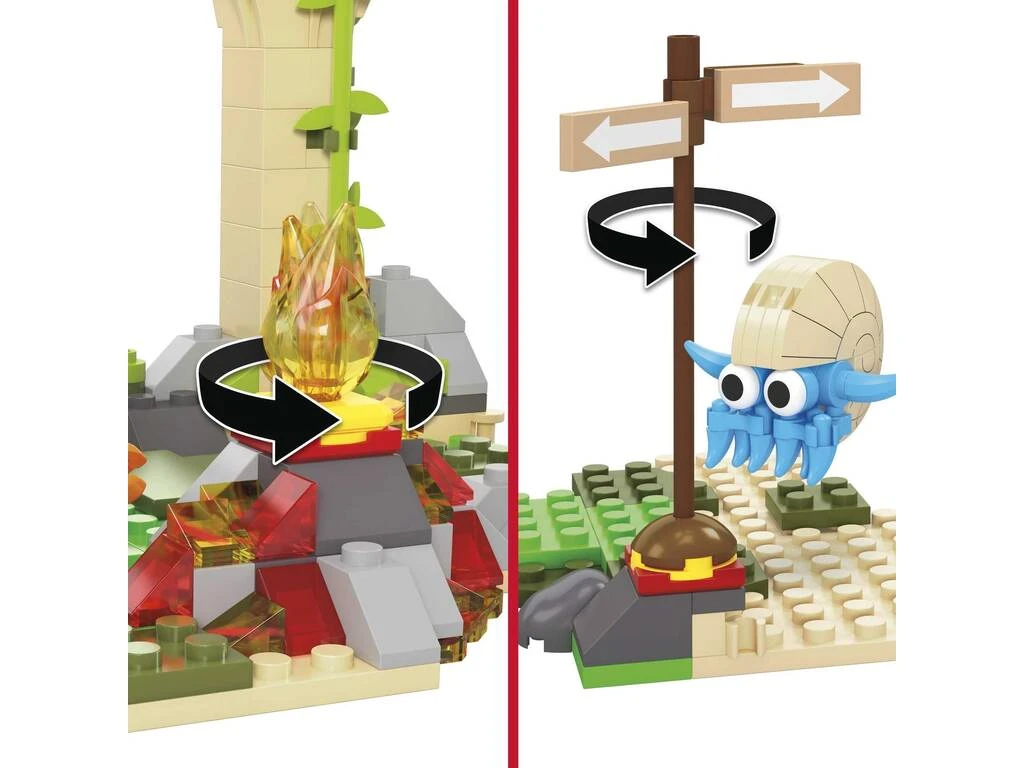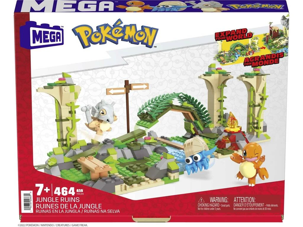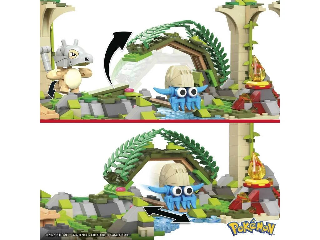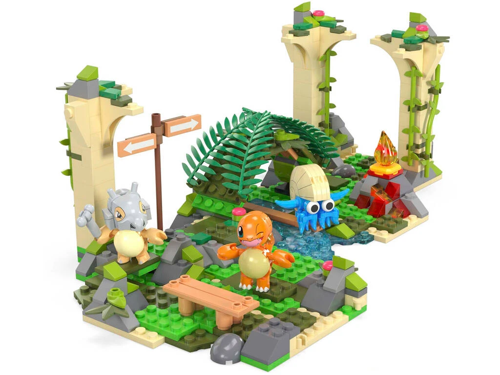 Incluye: 1 figura Charmander construible, 1 figura Cubone construible, 1 figura Omastar construible y 1 escenario construible de jungla con columnas, agua y muchos más espacios de juego.