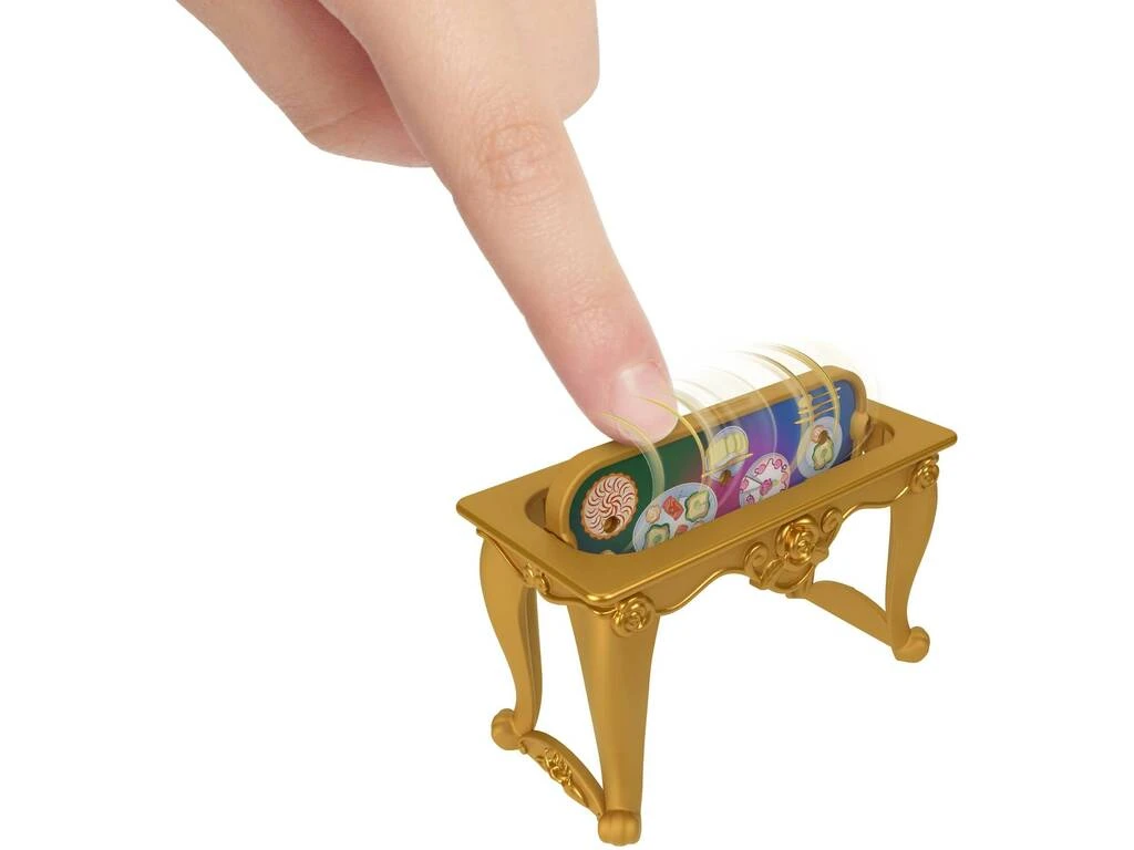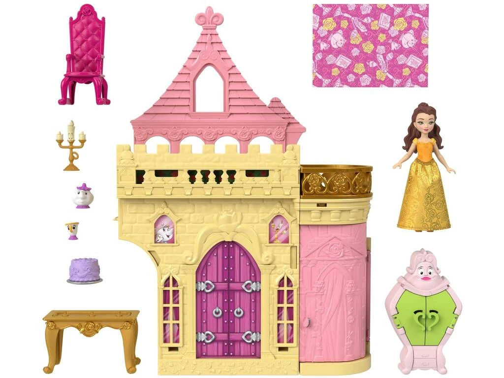 Incluye: 1 mini muñeca articulada Bella con falda dorada brillante, 1 figura Lumiere, 1 figura Sra. Potts, 1 figura Madame de Garderobe con puertas verdes, 1 castillo con mesa, sillón, bañera y diferentes espacios de juego.