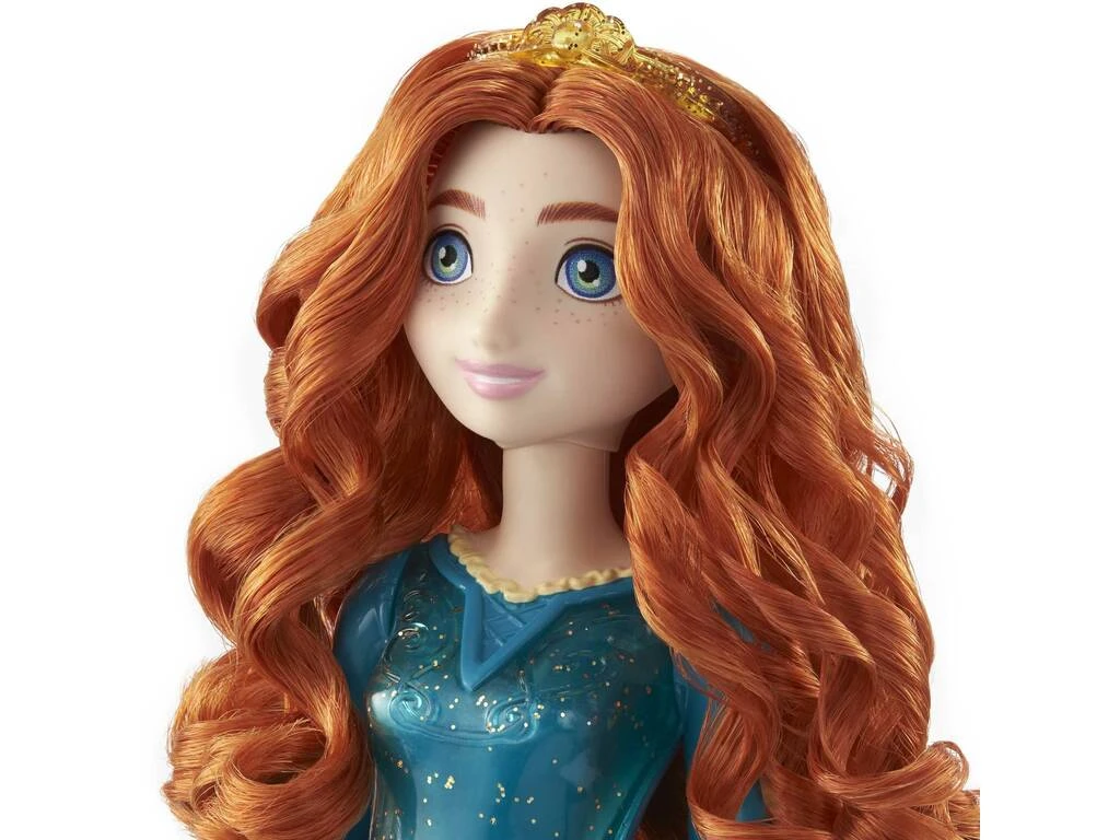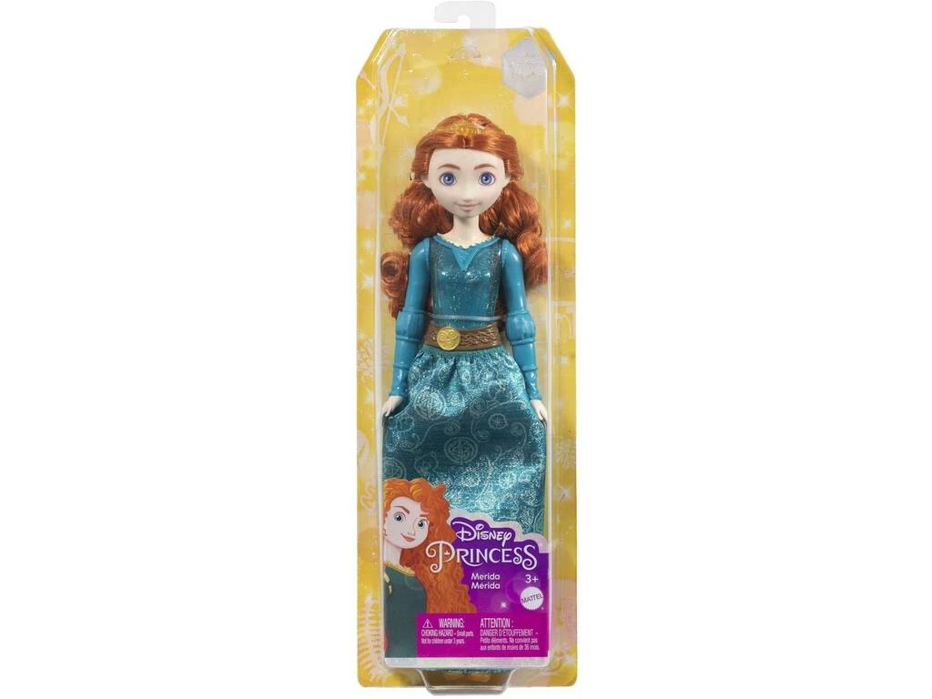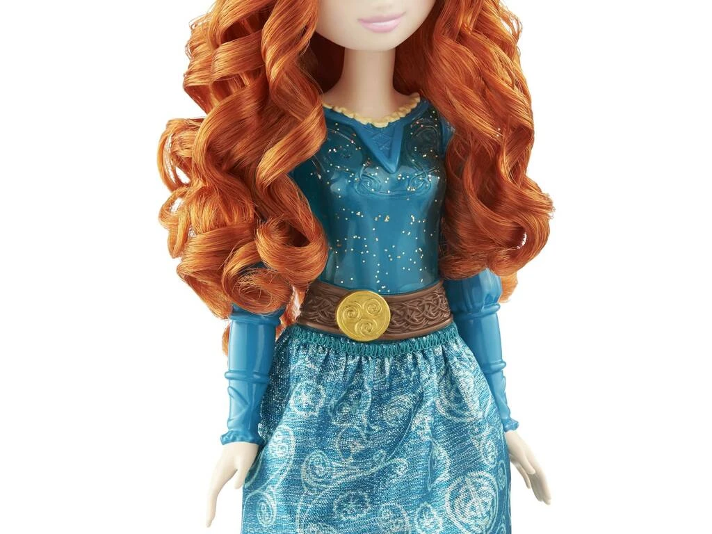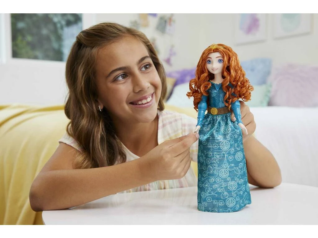 Incluye: 1 muñeca articulada Mérida con larga melena rizada morena, falda de tela, collar azul y diadema naranja.