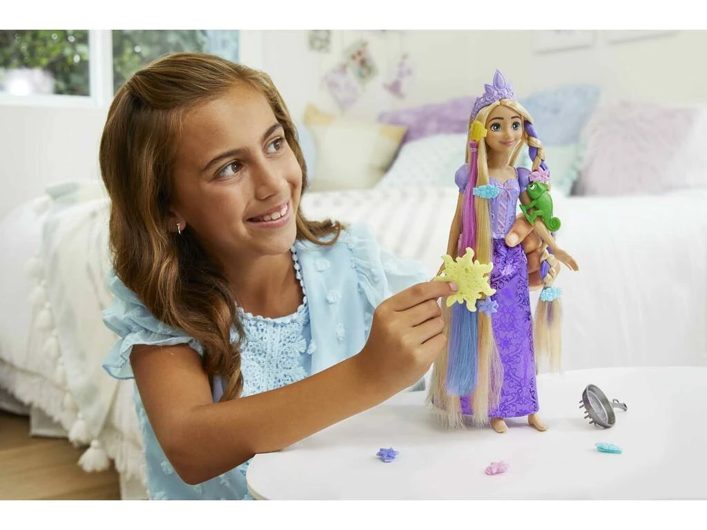 Incluye: 1 muñeca articulada Rapunzel con larga melena rubia, falda de tela morada con diseño brillante y tiara de color morada, 1 figura Pascal, 1 mecha de color morada que cambia de color, 1 mecha de color fucsia que cambia de color, 1 esponja especial para las mechas, 1 sartén que hace de cepillo para el pelo y 9 broches de colores para el pelo.