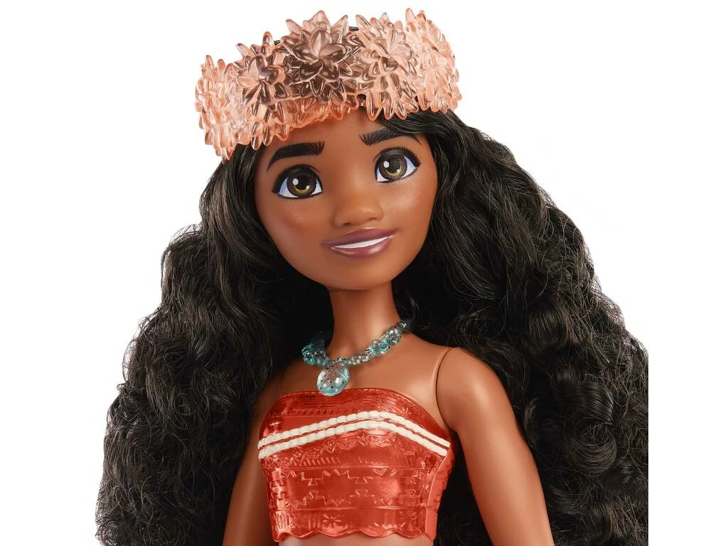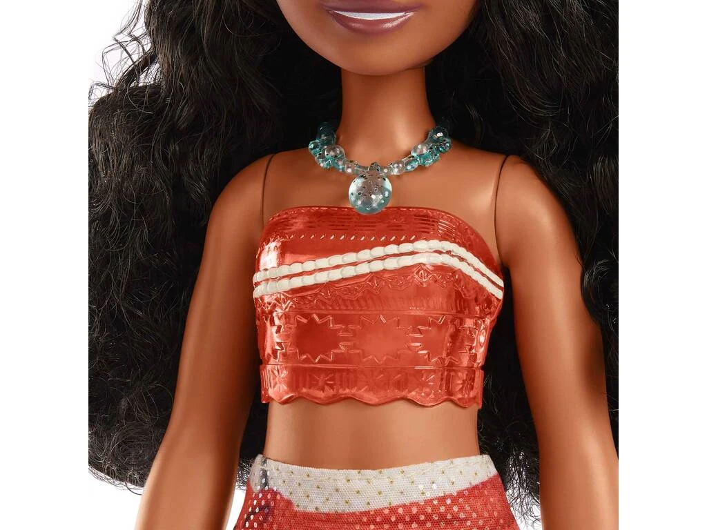 Incluye: 1 muñeca articulada Vaiana con larga melena rizada morena, falda de tela, collar azul y diadema naranja.