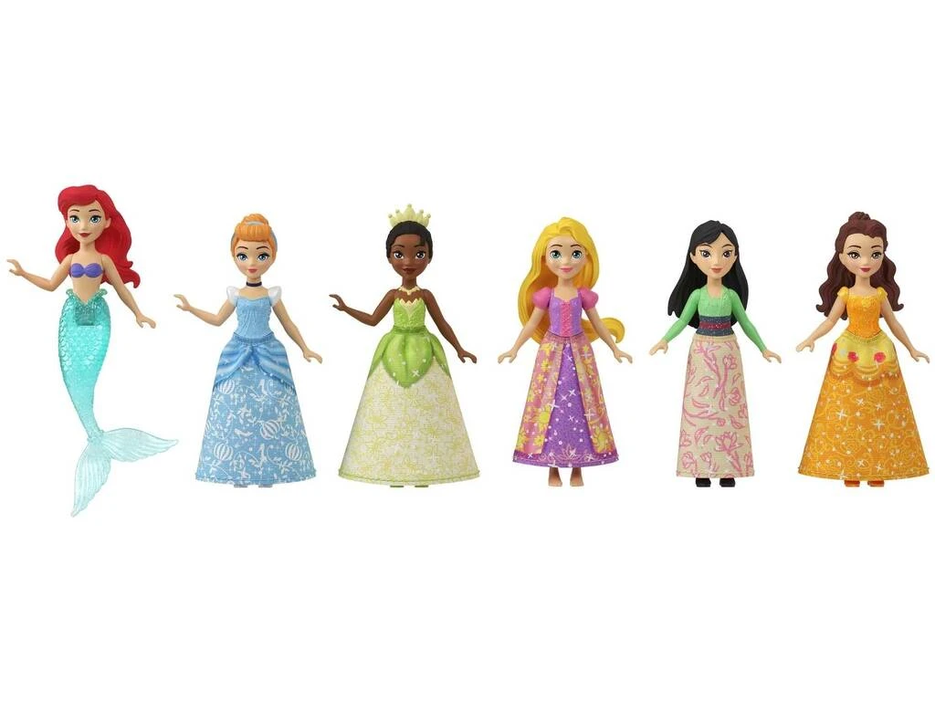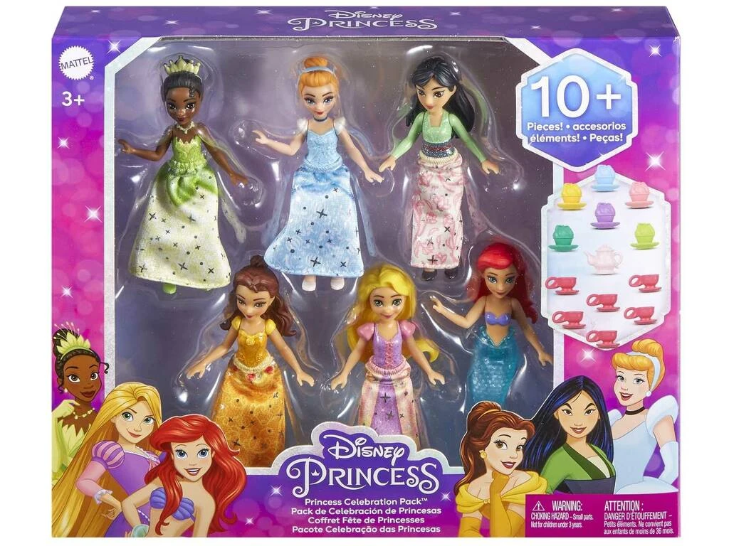 Incluye: 1 muñeca articulada Ariel, 1 muñeca articulada Mulán, 1 muñeca articulada Rapunzell, 1 muñeca articulada Cenicienta, 1 muñeca articulada Bella, 1 muñeca articulada Tiana, 6 tazas, 1 tetera y 6 cupcakes de colores.